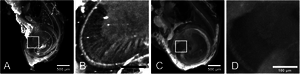 Maximum intensity projections (MIP) were performed on the reconstructed data of samples 1 and 2. (A) MIP of sample 1. The labeled neurofilament appears as a helical shape inside the cochlea. (B) Higher magnification of the highlighted area in A. The dendrites of the spiral ganglions are visible. (C) Negative control (sample 2). Only autofluorescence and nonspecific binding shows the outer shape of the cochlea. (D) Higher magnification of the highlighted area in C. |