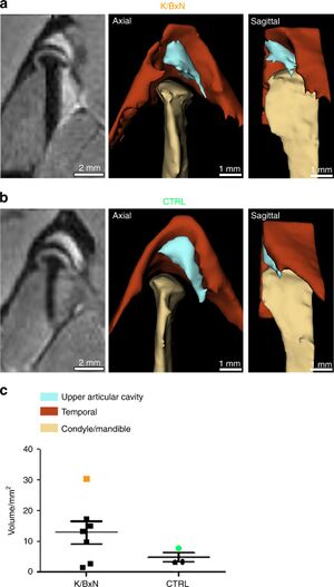 Comparison of synovial fluid volume of K/BxN and control TMJs. Magnetic resonance imaging (MRI) and 3D reconstructions of the TMJ of a K/BxN mouse (a) and a control mouse (b). c Volume measurement of the upper articular cavity of seven K/BxN mice and three control mice. The orange square represents the K/BxN mouse shown in a, and the green circle represents the control mouse shown in b. |