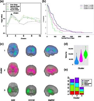 HOCUS of GBM MR Images. a. P-values of survival separation (log-rank test) for each of the orders of clustering across a range of k clusters. b. Kaplan-Meier plot of the third-order HOCUS clusters. c. Images of tumors within each cluster projected onto the MNI brain atlas. Showing sagittal, coronal, axial views. Brightness of color indicates the number of patients with tumor at a given location. Generated using 3D Slicer. d. Violin plot showing tumor volumes within each third-order cluster. e. Molecular (gene expression based) subtypes within the clusters. |