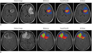 Example of segmentation results with two semi-automated software tools. Contrast-enhanced, necrotic, and non-enhancing T2 high signal intensity components are indicated by red, green, and blue color, respectively. A. Represents case in which similar segmentation results were produced. B. Represents case in which difference was observed in segmentation results. FLAIR = fluid-attenuated inversion recovery. |