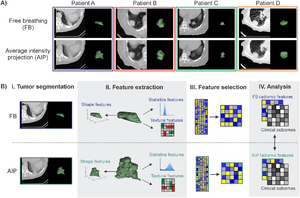A) Examples of free breathing (FB) and average intensity projection (AIP) images, demonstrating the observable differences in tumor phenotype between each image type. AIP images were reconstructed from 4D computed tomography (CT) scans. B) Schematic representation of the radiomics workflow for FB and AIP images. I. CT images of the patient are acquired and the tumor is segmented. II. Imaging features (radiomic and conventional features) are extracted from the tumor volume. III. Radiomic features undergo a feature dimension reduction process to generate a low-dimensional feature set based on feature stability and variance. IV. Imaging features are then analyzed with clinical outcomes to evaluate their prognostic power. FB and AIP radiomics features are compared. A set of 644 radiomic features was extracted from tumor volumes isolated from FB or AIP images (Fig 1B) using an in-house Matlab 2013 toolbox and 3D Slicer 4.4.0 software |