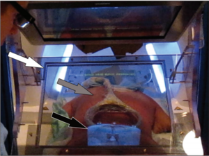 Procedural photograph demonstrating the operator’s augmented reality consisting of a hybrid view of MR image and underlying cadaver. The hybrid view is being created by the reflection of the target MR image (black arrow) from a semitransparent mirror (white arrow) into the line of sight of the operator, where it merges with the underlying cadaver (gray arrow). Location, size, and skin contour of MR image and cadaver are matched through co-registration by the image-overlay navigation system. |
