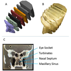 Nasal cavity model generation and fabrication. (A) 3D surface maps generated from CT scan slices of patient nasal cavity used to generate a 3D-printed model; (B) 3D-printed, sliced model, printed with two distinct polymers to represent hard and soft tissues; (C) Single coronal model slice with specific anatomical details highlighted. |