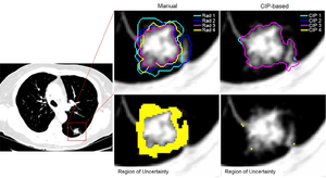 Comparison of manual (left) and CIP-based (right) segmentation. Yellow shaded region indicated the disagreement (or region of uncertainty) between contours performed by four radiologists (bottom left) or different CIP-based seed locations (bottom right). In this example, the region of uncertainty for manual segmentation was 3222 ml while the region was only 46 ml for the CIP-based segmentation. dsiCIP was ≈ 100%, while dsimanual was 88%. |