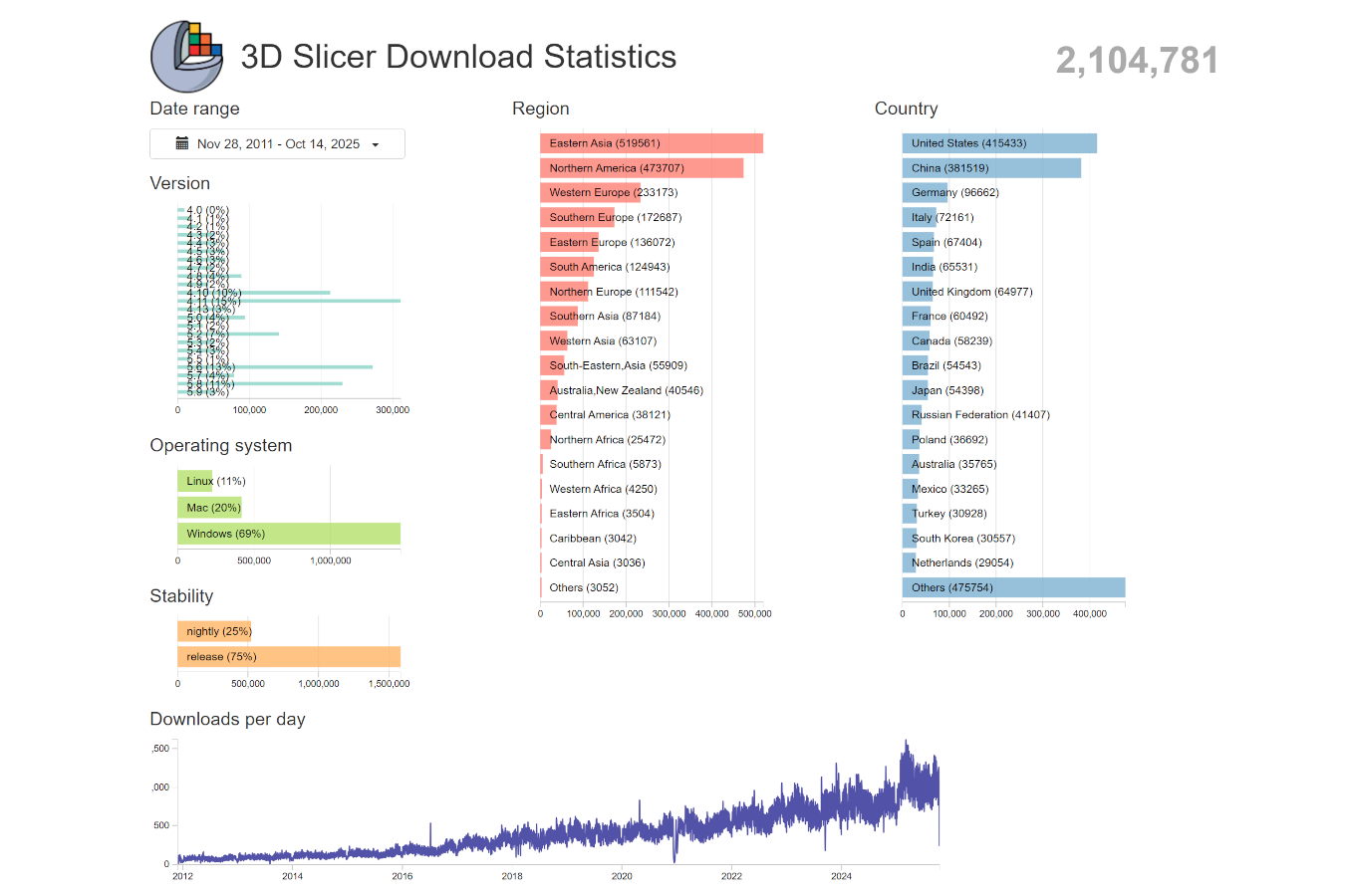 3D Slicer application installers have been downloaded over 2 million times in the past 14 years. learn more >